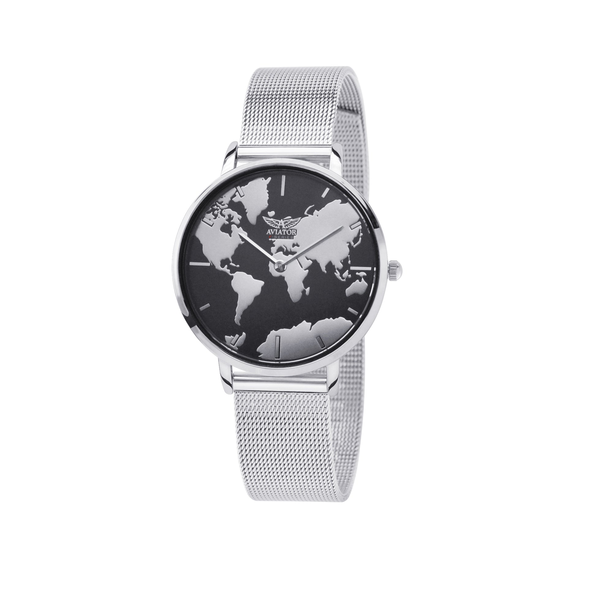 Die Aviator F Series „Luxe Set Silver“ vereint zeitlose Eleganz mit moderner Symbolik. Das schwarze Zifferblatt mit silberner Weltkarte steht für Fernweh, Freiheit und den Mut, Neues zu entdecken – perfekt ergänzt durch das feine Milanaise-Armband in Silber.