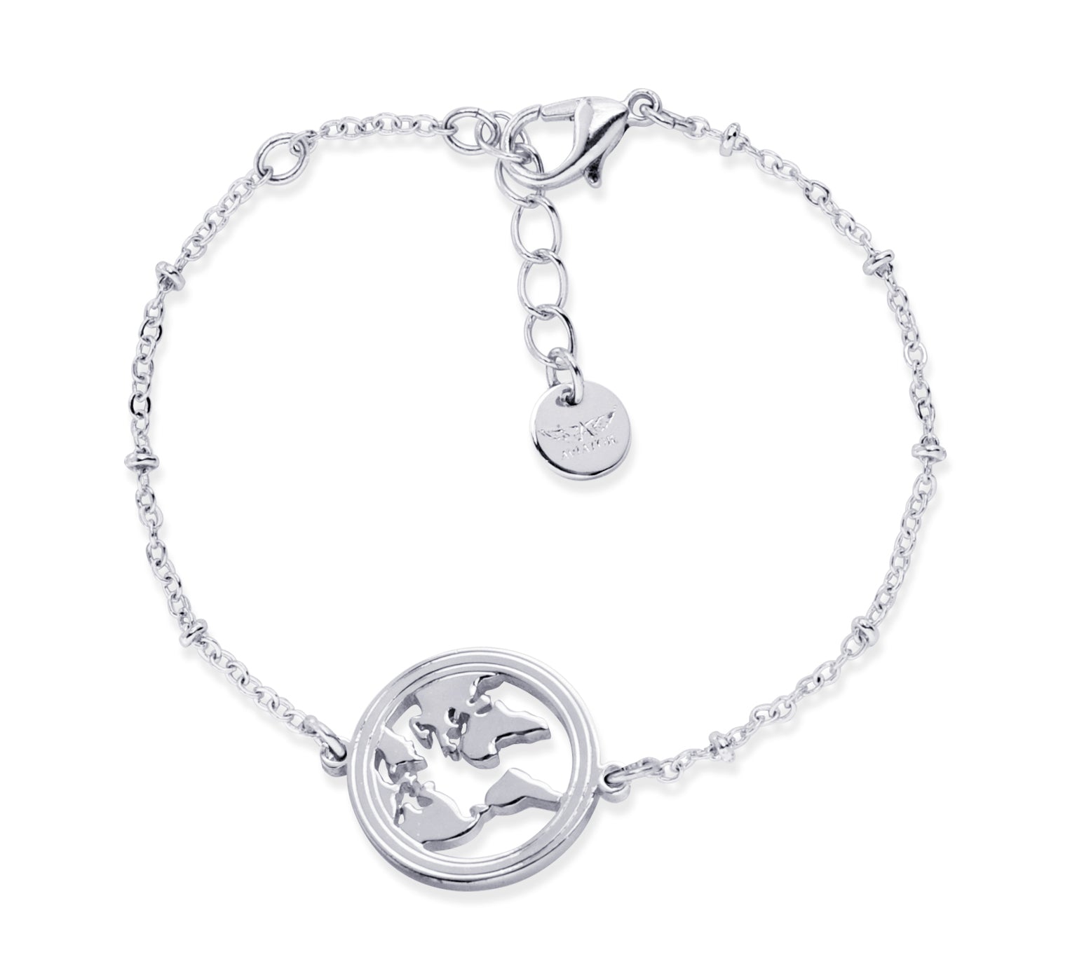 Zum Set gehört ein passendes Armband mit filigranem Weltkarten-Anhänger – ein dezentes Schmuckstück, das den Look harmonisch abrundet. Eine Uhr, die nicht nur Zeit misst, sondern Geschichten von Reisen und Träumen erzählt.